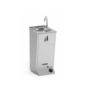 Lavamanos autónomos que no requieren conexión a suministro de agua ni desagüe. Su funcionamiento se basa en el bombeo del agua limpia desde uno de los depósitos internos; el segundo depósito se utiliza para recoger el agua usada (capacidad de 10 litros por depósito). El frontal incluye una papelera con trampilla abatible y soporte para bolsa de residuos. Equipados con asa trasera y ruedas para facilitar su transporte. Se entregan con todos los accesorios necesarios, incluyendo mangueras flexibles. La activación se realiza con un pedal manual que acciona el bombeo